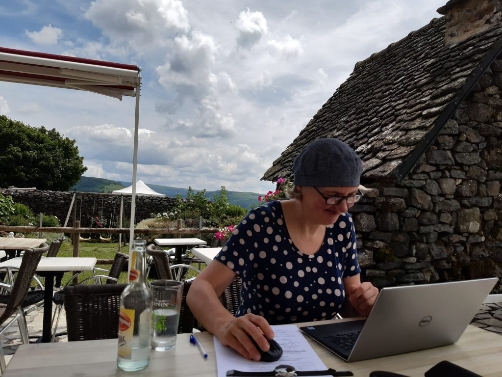 Letzte Vorbereitungen zum Notartermin am Samstag auf der Terasse vom Hotel in Salers.